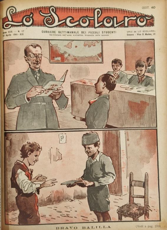 L’illustrazione realizzata con un disegno a china ed acquerelli riproduce, quasi a pagina intera, in una scansione che ricorda i fotogrammi cinematografici, la scena di un giovane balilla che, ligio al dovere, frequenta la scuola e si dedica con zelo allo studio. Come mostra la prima sequenza il giovane balilla viene interrogato dal maestro e sembra parlare con atteggiamento calmo e fiero. Nella seconda scena compie una buona azione donando un libro ad un ragazzo probabilmente appartenente ad una realtà più disagiata e ad un contesto extracittadino. La vignetta mette in risalto il differente livello di scolarizzazione tra i centri urbani e le comunità rurali. Il racconto per immagini veicola inoltre un messaggio propagandistico proponendo ai giovani lettori la figura del balilla come modello di comportamento da seguire.