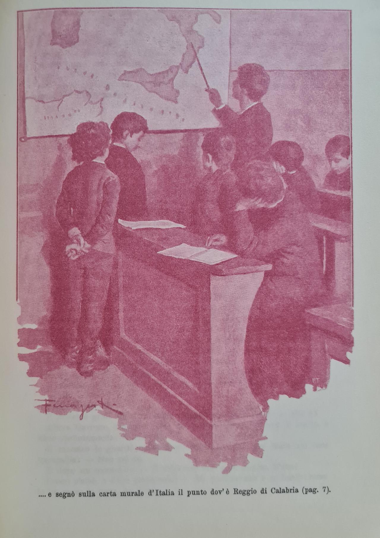 Nell’immagine qui riprodotta, Ferraguti illustra l’ingresso nella sezione Baretti di uno scolaro proveniente da Reggio Calabria, che il maestro Perboni accoglie con parole cariche di enfasi, mostrando agli allievi sulla carta dove si trova la Calabria sulla carta geografica: «Ricordatevi bene di quello che vi dico. Perché questo fatto potesse accadere, che un ragazzo calabrese fosse come in casa sua a Torino, e che un ragazzo di Torino fosse come a casa propria a Reggio Calabria, il nostro paese lottò per cinquant’anni e trentamila Italiani morirono» (p. 7). La scuola qui ritratta non è soltanto il luogo dei sentimenti, ma anche, e soprattutto, motore di integrazione etica e civile, fulcro di emancipazione e di costruzione dell’unità e dell’identità nazionale.