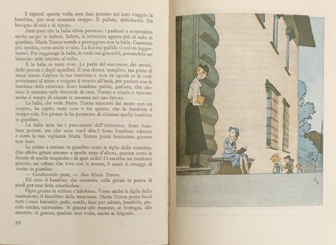 Alcuni bambini stazionano fuori il portone di un grande edificio, probabilmente una scuola o un collegio. Ad attenderli sulla soglia una giovane istitutrice. È il momento in cui si ritrovano tutti per giocare insieme dopo la scuola. È interessante notare come nel testo si sottolineino le differenze di ceto. Del resto, il volume è consigliato alle scuole dei centri urbani. L’illustrazione, a firma del pittore Piero Bernardini, che a partire dagli anni Venti collabora come illustratore ai principali periodici illustrati dell’epoca, si caratterizza per l’uso di larghe campiture a tinte piatte e per la reiterazione della linea come principale mezzo compositivo ed espressivo dei suoi disegni.