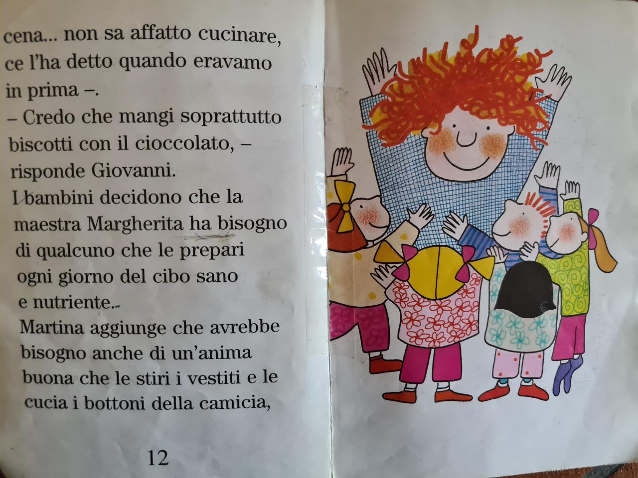 L’illustratrice triestina Nicoletta Costa, autrice di numerose storie per i piccoli lettori, vincitrice di molti premi e ideatrice di noti e amati personaggi come Giulio Coniglio, la nuvola Olga, la strega Teodora e l’albero Giovanni, ripresenta in questo albo la figura della maestra Margherita, già presente in Margherita maestra dormigliona (Emme Edizioni, 1997) e successivamente in Margherita non ne può più (Emme Edizioni, 1999). Margherita, maestra di scuola primaria distratta e pasticciona, «spettinata, stropicciata, senza bottoni, ma tanto simpatica!» (p. 33), è spesso oggetto delle preoccupazioni dei suoi saggi e previdenti alunni, in questo breve racconto impegnati a trovarle un marito che se ne prenda cura. In particolare, nell’illustrazione in oggetto, Margherita è rappresentata sorridente e coi rossi capelli arruffati in mezzo ai suoi scolari: l’immagine, dal tratto infantile che è l’inconfondibile cifra stilistica della Costa, comunica allegria, mentre le braccia protese dei bambini e i loro volti gioiosi mostrano l’affetto sincero che i piccoli nutrono per la stravagante insegnante.