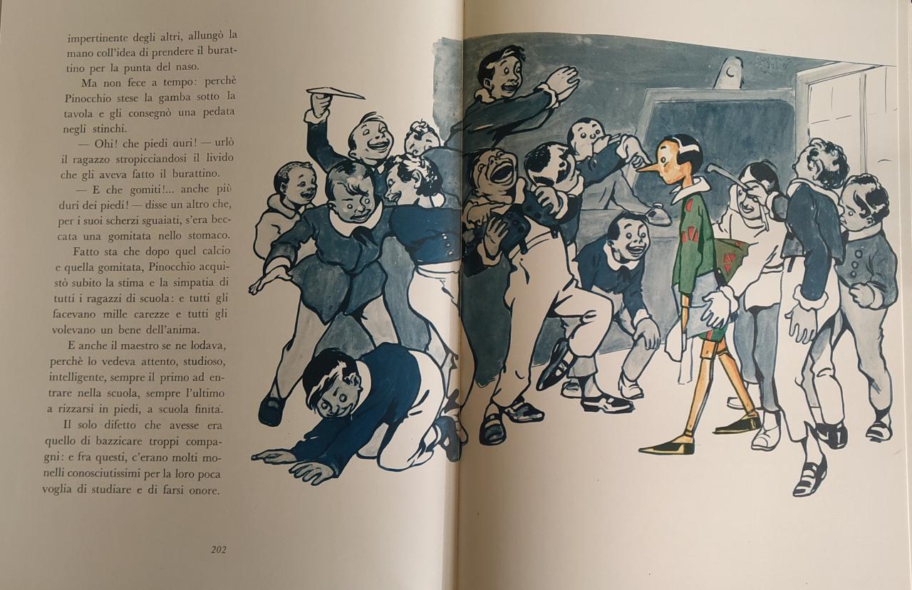 L’illustrazione descrive uno degli episodi centrali del celebre romanzo di Carlo Collodi, Le avventure di Pinocchio,originariamente pubblicato a puntate tra il 1881 e il 1882 sul «Giornale per i bambini», poi edito in versione integrale nel 1883. La scena illustrata rimanda all’episodio in cui Pinocchio, su consiglio della Fata, va a scuola, dove però viene deriso dai suoi compagni per il suo aspetto di burattino di legno. Tuttavia Pinocchio impara a farsi rispettare a suon di gomitate e calci mentre cerca di mostrarsi diligente e zelante agli occhi del maestro per farsi accettare. La firma è di Attilio Mussino, celebre illustratore di libri e periodici per l’infanzia, che nel corso della sua vita realizza numerose versioni illustrate di Pinocchio per la casa editrice Bemporad, disegnando centinaia di tavole di stile e qualità differenti. Si deve a Mussino, nel 1911, la prima edizione illustrata a colori del capolavoro di Collodi, pseudonimo del giornalista e scrittore fiorentino Carlo Lorenzini. Da notare che il Pinocchio di Mussino si discosta dall’austero realismo del bianco e nero utilizzato nelle illustrazioni di Enrico Mazzanti (che cura l’apparato illustrato della prima edizione del 1883) e successivamente di Carlo Chiostri. Il colore nelle grandi tavole di Mussino diventa elemento narrativo e invade il testo occupando la doppia pagina. In ogni episodio Mussino è molto attento a cambiare la tonalità cromatica per fornire un’immediata chiave interpretativa del racconto ed enfatizzare, in base alla scelta del colore, le scene e i protagonisti. In questa illustrazione, alla stregua dei cartoni animati, Mussino adotta infatti tonalità scure, come il blu e il grigio, per rappresentare il carattere drammatico di situazioni di pericolo, di disagio o di isolamento del protagonista. Il burattino, accerchiato dai suoi compagni di scuola, è l’unico raffigurato con i suoi colori naturali.