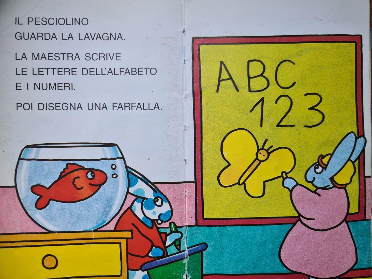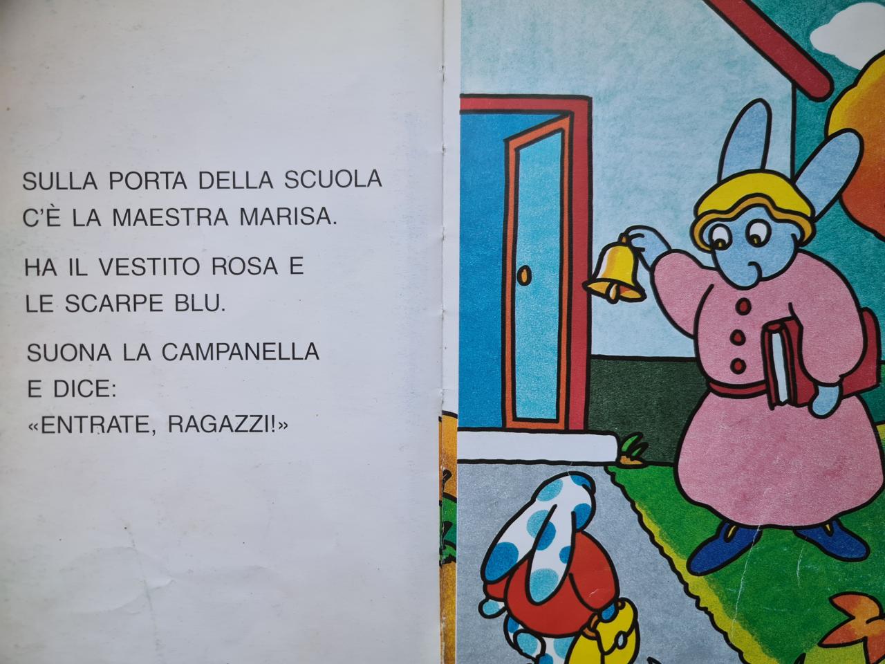 Francesco Tullio Altan, noto illustratore e vignettista satirico conosciuto tra i piccoli lettori come “padre” della Pimpa, la cagnolina a pois rossi, è creatore di numerosi altri personaggi che animano da ormai molti anni e con grande successo le storie e l’immaginario visivo dei bambini. In questo piccolo volume edito nella collana “Prime letture” di Emme Edizioni, fa la sua comparsa Coniglietto, uno degli amici della Pimpa, qui alle prese col suo primo giorno di scuola. Nelle immagini scelte, il coniglio a pois celesti giunge a scuola in ritardo dopo aver recuperato la cartella inavvertitamente caduta nel fiume. La maestra Marisa, una coniglietta col vestito rosa e le scarpe blu dall’aria assai benevola, l’accoglie con la campanella in mano. Nella sequenza di immagini successiva la scorgiamo dietro la cattedra, dinnanzi alla scolaresca di conigli. Nel prosieguo del racconto, Coniglietto nota che un pesciolino rosso è rimasto dentro alla sua cartella: Marisa lo mette in un vaso pieno d’acqua e invita lo scolaro a riportarlo al fiume dopo la lezione non prima di aver seguito tutte le lezioni, cui partecipa anche il pesciolino.