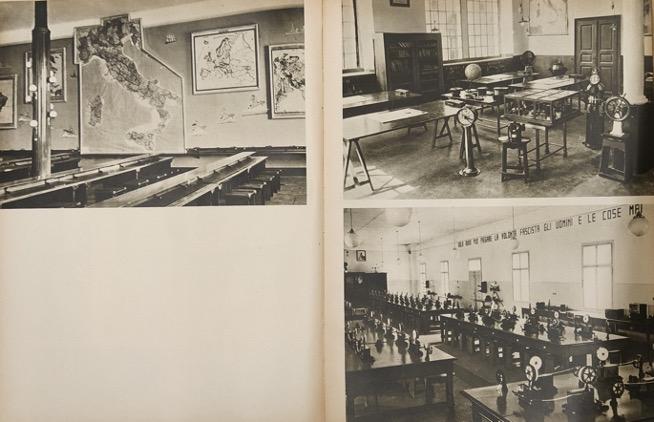 La pubblicazione - non datata ma ascrivibile alla seconda metà ventennio fascista, presumibilmente al 1941 – costituisce un caso particolarmente interessante di utilizzo della fotografia come strumento narrativo che sostituisce per intero l’apparato testuale. Questo medium veniva utilizzato frequentemente dalla propaganda e dalla retorica fascista per diffondere tutte le ‘imprese’ del governo fascista dentro e fuori i confini nazionali, mutuando linguaggi e strumenti già utilizzati dalle avanguardie storiche (basti pensare all’uso del fotomontaggio in Unione Sovietica). In questo caso si tratta di un reportage fatto in diverse scuole della Regia Marina Militare. Accanto alle foto delle aule, compaiono fotografie degli allievi colti in atteggiamenti di cameratismo e intenti a fare esercitazioni pratiche, praticando il culto del corpo alla base della retorica e dell’educazione fascista. Le foto sono state realizzate dal famoso Stabilimento Ferruzzi, noto tra gli anni Venti e gli anni Ottanta per gli scatti di cronaca, di avvenimenti di carattere culturale, di arti e mestieri, di attività produttive e industriali del nostro Paese. Ferruzzi realizzò questo fotolibro in collaborazione con l’Istituto Luce che verosimilmente produsse una documentazione video della visita in queste scuole.