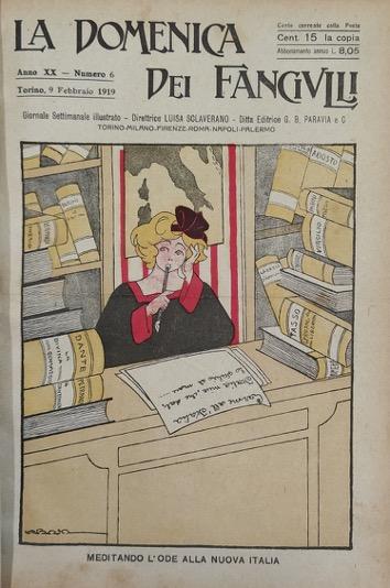 Nato a Torino nel 1900 ed edito da Paravia, casa editrice specializzata in discipline pedagogiche e libri per l’infanzia, «La Domenica dei Fanciulli», pubblicato fino al 1920, si distingue per la grafica di gusto liberty delle copertine a colori, firmate dalla coppia di illustratori Domenico Gaido e Giulio Brugo. Fondato da Cecilia Comino e diretto dal 1902 da Luisa Sclaverano, il periodico accoglie spesso scene illustrate di vita scolastica. Nell’immagine di copertina qui riprodotta una giovane alunna è intenta a scrivere, come riporta il titolo, un’ode all’Italia, circondata da numerosi volumi di autori capisaldi della letteratura italiana – da Dante ai più recenti, come Gabriele D’Annunzio – che dovrebbero ispirare le nuove generazioni a costruire un’identità culturale nazionale dopo la tragedia della prima guerra mondiale.