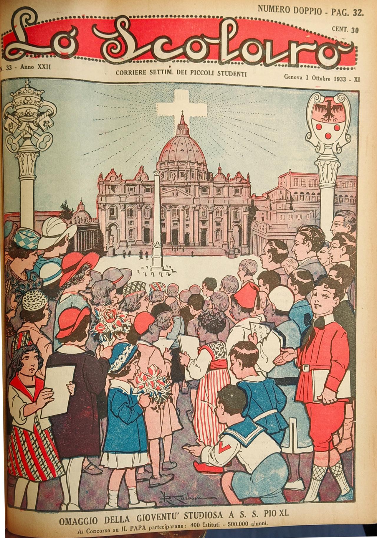 La copertina del trentatreesimo numero de «Lo Scolaro» ospita un’illustrazione a tutta pagina dedicata al pontefice Pio XI, che riceve gli omaggi di una comunità di giovani studenti riuniti davanti la Basilica di San Pietro e accompagnati dai loro docenti. Il manifesto carattere celebrativo dell’illustrazione, indice dell’orientamento cattolico del settimanale, non fornisce tuttavia ulteriori dettagli sulla circostanza storica a cui fa riferimento: un raduno di studenti istituito dal pontefice o presumibilmente un’udienza papale. Ad ogni modo la copertina si rivela un’interessante fonte iconografica per lo studio dei rapporti tra la Chiesa cattolica e il regime fascista in materia di educazione giovanile negli anni immediatamente successivi alla firma dei Patti Lateranensi, che registrano diversi momenti di tensione e frizione, come la strenua difesa dell’Azione Cattolica contenuta nell’enciclica di Pio XI Non abbiamo bisogno del 1931 dopo i tentativi di Benito Mussolini di sciogliere l’associazione. In questo senso, la scelta di includere la partecipazione di studenti stranieri di colore, raffigurati in maniera molto caratterizzata dall’illustratore che ad oggi risulta non identificato, concorre, insieme alle contingenze storiche, a trasmettere al lettore un messaggio di rivendicazione dell’autorità della Chiesa cattolica nel campo dell’educazione giovanile, difendendo inoltre l’opera di evangelizzazione portata avanti in Italia e nel mondo in maniera capillare dall’associazionismo cattolico.