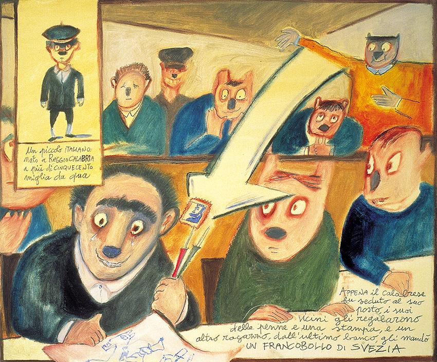 A distanza di oltre un secolo dalla prima edizione del Cuore di De Amicis, l’editore Corraini di Mantova ne propone una versione in cui nel testo originale si inseriscono le irriverenti e provocatorie illustrazioni di Federico Maggioni e di Alberto Rebori. In questa vivace illustrazione di Rebori, che occupa due intere pagine, è raffigurato il celebre episodio dell’ingresso in aula del ragazzo calabrese, «un nuovo iscritto, un ragazzo di viso bruno, coi capelli neri, con gli occhi grandi e neri, con le sopracciglia folte e raggiunte sulla fronte; tutto vestito di scuro» (p.10). Ma se il testo narra dell’«abbraccio dei figliuoli del Piemonte al figliuolo della Calabria» attraverso il quale il nuovo arrivato può ben sperimentare che «in qualunque scuola italiana metta piede, ci trova dei fratelli» (Ibidem), l’interpretazione umoristica e caricaturale dell’illustratore genovese demistifica il pathos di cui la narrazione è intrisa per mostrarci un’improbabile classe maschile composta da scolari che hanno tutte le sembiante di orsacchiotti: il naso nero e le orecchie rotonde che spuntano dalla testa degli allievi seduti al loro banco ricordano la metamorfosi animalesca che subisce Pinocchio con i suoi compari al Paese dei Balocchi e provocano un evidente corto circuito tra rappresentazione iconografica e retorica del testo. In quest’immagine il calabrese, di cui campeggia una figurina con didascalia in alto a sinistra, è collocato in primo piano; visibilmente commosso e imbarazzato, riceve dai compagni penne, una stampa, e persino un francobollo di Svezia che gli giunge in volo dall’ultimo banco. Occorre ricordare che anche la prima edizione di Cuore fu affidata dall’editore Treves al dialogo interpretativo di più autori: Ferraguti, Nardi e Sartorio hanno così contribuito alla formazione di un immaginario visivo rimasto intatto per quasi un cinquantennio e sostanzialmente capace di comunicare una contiguità ideologica e pedagogica tra testo e immagine, dunque in complicità con il messaggio deamicisiano. Caduti i diritti d’autore nel 1965, Cuore assiste all’avvicendarsi dei contributi espressivi di un notevole numero di artisti e illustratori, sino alla prova d’autore in questione, una delle più recenti e interessanti, che senz’altro rompe con l’immagine tradizionale di scuola qual è quella veicolata dal romanzo.