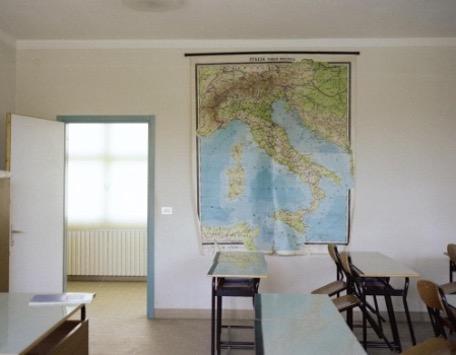 «Il primo incontro con le architetture di Aldo Rossi risale a quando Vittorio Savi mi propose di fotografare il cimitero di Modena. […] Sembrò che mi si rivelasse il segreto per un approccio all’architettura e alla sua rappresentazione fotografica. […] Tutte le volte, questi fabbricati, scenografia, cimitero, casa o scuola che sia, mi stupiscono […] per la loro aria immediatamente familiare e insieme misteriosa, una straordinaria fusione tra ritrovamento e mai visto, tra conosciuto e ignoto»(L. Ghirri, Per Aldo Rossi, in Id., Niente di antico sotto il sole. Scritti e interviste 1973-1991 (1997), Quodlibet, Macerata 2021, p.197). Dietro l’apparente semplicità di quest’immagine, l’interno di un’aula della scuola media Contaldo Ferrini di Broni progettata da Aldo Rossi (1979-1981), Ghirri riesce a cogliere, pur nella fissità dello scatto, quell’attenzione alle forme, alla luce e al rapporto tra l’edificio e il suo contesto che accomuna il lavoro del fotografo ai progetti dell'architetto. L’aula è vuota, non ci sono docenti o studenti, eppure a caratterizzare lo spazio ci sono i banchi, il registro sulla cattedra e una cartina geografica dell’Italia con le pieghe e l’usura del tempo. La luce è mantenuta volutamente tenue come tenui sono i colori dell’aula e dell’edificio di Rossi, che per Ghirri «sembrano voler dialogare con quelli un po’ spenti dei luoghi dove sorgono»(L. Ghirri, Per Aldo Rossi, cit., p.200). Come in una foto analoga, Scuola di San Maurizio (Reggio Emilia, 1985), Ghirri coglie l’ambiente senza ricostruirlo e senza cambiare l’arredamento della stanza, mostrandolo nella sua integrità come uno spazio non decorativo ma come «uno spazio che viene vissuto dalle persone» attraverso foto per sua stessa ammissione «meno curate» rispetto a quelle di paesaggio (L. Ghirri, Lezioni di fotografia, a cura di G. Bizzarri-P. Barbaro, Quodlibet, Macerata 2010, pp.40-41).