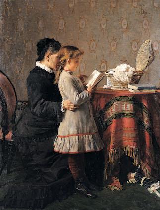 Dono della Regina Margherita di Savoia alla Giunta Municipale di Peschiera del Garda nel 1899, il dipinto raffigura una donna anziana intenta a seguire una bambina, forse sua nipote, mentre ripete la lezione, in un interno borghese. Nell’opera si ritrova l’attenzione di Silvestro Lega al mondo dell’infanzia e degli affetti dei dipinti realizzati a Piagentina - sobborgo fiorentino fuori Porta della Croce dove Lega soggiorna per dieci anni e dove abbandona a livello pittorico i temi di storia contemporanea per dedicarsi alle scene di genere - come suggerisce l'intimità dell’ambiente domestico e il gesto della donna che sembra stringere amorevolmente a sé la bambina. La luce diffusa e sfumata sui due volti insieme all’intensità cromatica mettono in risalto gli abiti e la quiete dell'ambiente entro cui si svolge la scena, in un’atmosfera simile al dipinto La lettura del 1888. Il pavimento leggermente rialzato e la compostezza delle figure sono indice di una pittura non aneddotica, molto controllata, che guarda ai modelli della pittura quattrocentesca italiana. La scelta del tema tradisce la fede mazziniana dell'autore nella definizione di un'unità nazionale che si manifesta attraverso un processo generalizzato di istruzione e di emancipazione femminile.