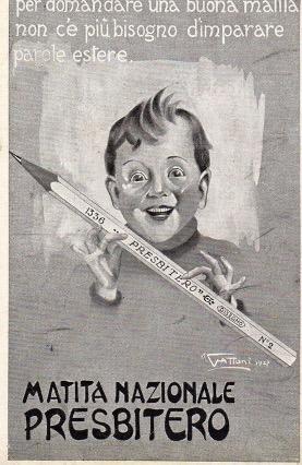 La società Presbitero nasce nel 1920 e presto cambia il suo nome in Società Anonima Matita Nazionale Pennino Nazionale Presbitero, che resta in attività fino ai primi anni Cinquanta. In realtà, la produzione di matite inizia già durante la prima guerra mondiale. Più tardi, nel 1927, l’azienda chiama Fortunato Depero per una nuova campagna pubblicitaria e inizia in parallelo a vendere pennini in acciaio, come mostra un altro celebre manifesto degli anni Trenta, ora nella collezione Salce, che riunisce due precedenti affiches pubblicitarie fatte rispettivamente da Roberto Aloy e Marcello Dudovich (l’uomo con le matite in testa e il giovane laureando con un pennino appoggiato sulla feluca). Da sempre sostenitore dei prodotti italiani, Pietro Presbitero commercializza matite fatte in Italia a tutta mina e rivendica questa cifra negli slogan pubblicitari a stampo autarchico, che echeggiano nei contenuti molti messaggi della propaganda fascista di quegli anni. Il manifesto si rivolge direttamente agli studenti delle scuole, rappresentati dal bambino che, felice e soddisfatto, tiene in mano la matita Presbitero scoraggiando l’acquisto delle matite prodotte all’estero.
