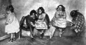 Accanto a lei alcuni bambini, seduti in maniera scomposta su una panca e probabilmente in attesa che l’esercizio sia concluso, sono ritratti in atteggiamenti più autentici e genuini: forse sono annoiati.