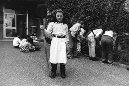 Un gruppo di bambini si occupa della cura e della manutenzione degli spazi verdi attorno alla scuola di Via Canzio a Cinisello Balsamo. Al centro una bambina posa davanti all’obiettivo reggendo con la mano destra la zappa e così richiamando all’atteggiamento ieratico e all’iconografia tipici della ritrattistica del mondo agricolo. Con fine realismo, il fotografo mette in risalto uno dei lasciti fondamentali dell’educazione montessoriana per la scuola: da una parte la didattica all’aperto per gli alunni che si cimentano in un’attività manuale che li stimola a sperimentare e a sviluppare nuove abilità e attitudini, dall’altra l’attività di gruppo come pratica inclusiva. La fotografia di Gianni Berengo Gardin documenta un importante momento di vita scolastica e fa parte di un servizio fotografico commissionato dal comune di Cinisello Balsamo al fotografo veneziano.