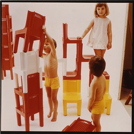 Nel 1959 il Comune e la Triennale di Milano bandiscono un concorso per lo studio e la progettazione di arredi scolastici per i bambini delle scuole elementari. Marco Zanuso vi partecipa insieme a Richard Sapper, all’epoca suo giovane collaboratore. La ricerca progettuale impegna Zanuso e Sapper a lungo, circa cinque anni: inizialmente elaborano una proposta per una seduta in compensato curvato, poi scartata. I progettisti si orientano allora verso l’utilizzo della lamiera d’acciaio, utilizzata proprio in quel frangente da Zanuso per la produzione della sedia Lambda, ma il materiale risulta troppo costoso e poco adatto ai bambini. La soluzione arriva contattando l’azienda Kartell di Giulio Castelli, specializzata nella produzione di oggetti di plastica, materiale che si afferma definitivamente negli anni Sessanta nella vita quotidiana e nel campo della moda, dell’arte e del design. Si passa così all’ipotesi di produrre una sedia in polietilene che fosse colorata, leggera e maneggevole. La seduta viene allora concepita sia come un arredo scolastico a misura di bambino sia come un oggetto per il gioco: una sedia modulabile, con le gambe smontabili e impilabili analogamente alle costruzioni LEGO, in grado di trasformarsi in molteplici strutture architettoniche reali o di fantasia, le stesse che compaiono in alcune celebri campagne pubblicitarie del prodotto.