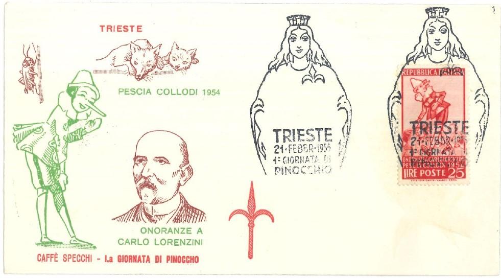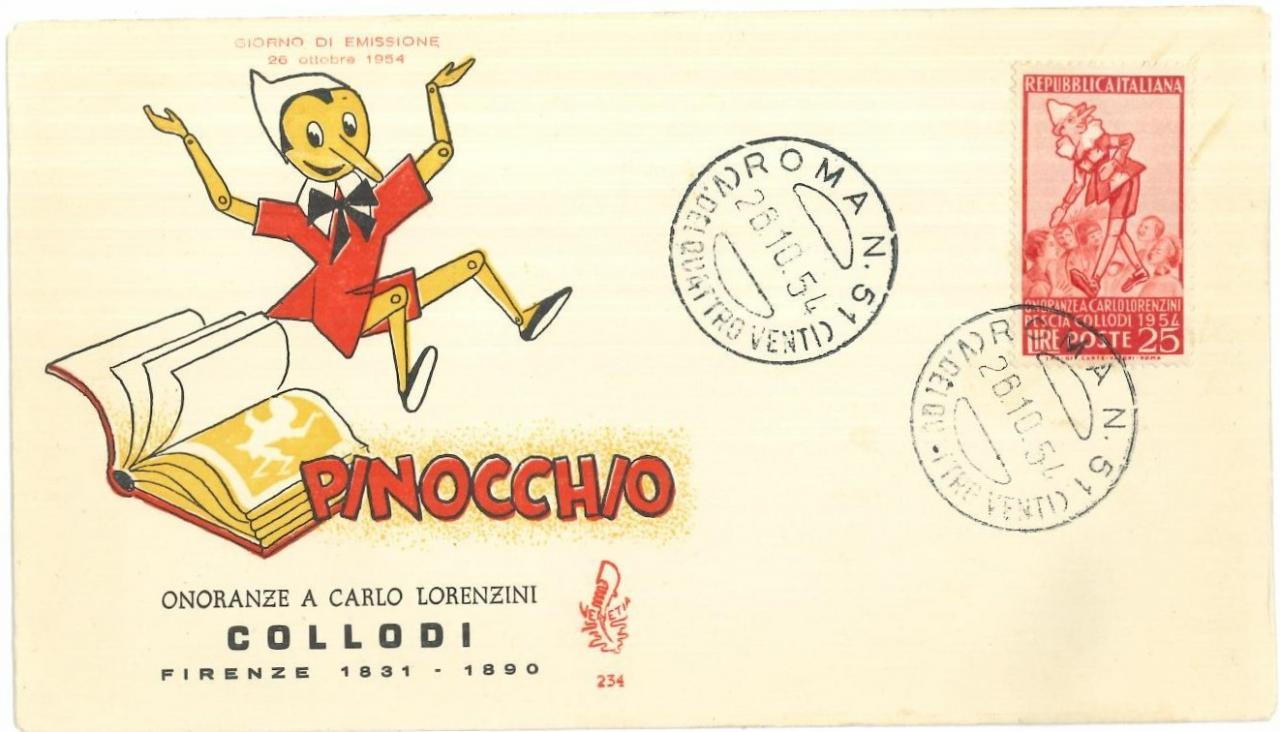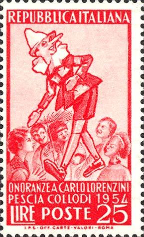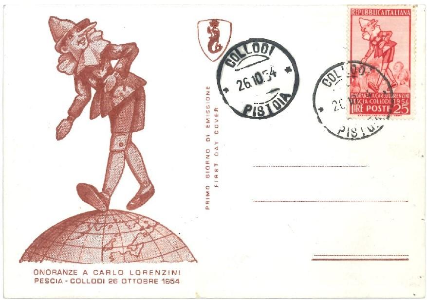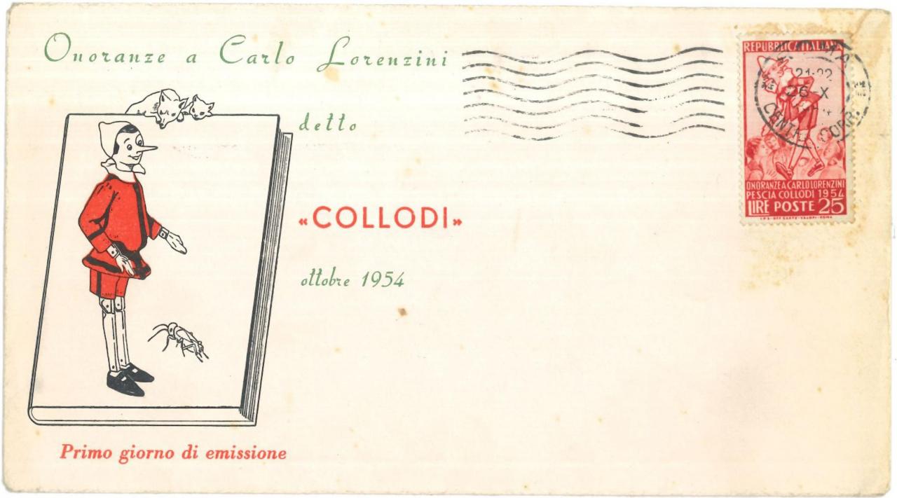 Del valore di L. 25, il francobollo commemorativo di Carlo Lorenzini fu emesso nel giorno del sessantaquattresimo anniversario della sua morte, il 26 ottobre 1954. Con questo omaggio filatelico il Ministero delle Poste e delle Telecomunicazioni voleva contribuire alle onoranze tributate in quell’anno al padre di Pinocchio dal Comune di Pescia (si rammenta che lo scrittore aveva tratto lo pseudonimo con cui è noto dalla frazione pesciatina di Collodi, dove era nata sua madre). La vignetta ritrae in primo piano Pinocchio; in basso, in secondo piano, cinque ragazzi – rappresentanti i continenti – guardano ammirati la creatura collodiana. Il disegno è opera di Attilio Mussino, autore delle illustrazioni dell’edizione de Le avventure di Pinocchio pubblicata da Bemporad nel 1911. La redazione del testo del bollettino illustrativo dell’emissione del francobollo fu affidata al prof. Felice Del Beccaro; a proposito del capolavoro collodiano – che aveva «conosciuto un numero eccezionale di edizioni» ed era stato tradotto «in tutte le lingue del mondo nonché in vari dialetti per un totale, a quanto pare, di sei milioni di esemplari» – lo studioso commentò che «l’originalità dell’insegnamento, che sta appunto nella mancanza di pedanteria, aprì una nuova era nella storia della letteratura per l’infanzia: è l’esperienza della vita, la realtà di questa, intesa nella sua fondamentale varietà, ad ammonire. Pinocchio è, in sostanza, un personaggio intimamente umano e la ironia che spesso le sue avventure suggeriscono non fa che stimolare una sana concezione della vita, al di fuori di ogni retorica pedagogica e di ogni falso richiamo all’ordine e alla saggezza». L’emissione del francobollo attivò la produzione di una serie di “first day cover – fdc”, buste prodotte da soggetti pubblici o privati di formato standard 16,5 x 9,5 cm, riportanti uno o più francobolli e timbrate con un annullo speciale primo giorno attinente il tematismo dell’emissione (almeno 5 fdc diverse, es. FIG. 2, FIG. 3 e FIG. 4). Oltre a cartoline e buste commemorative realizzate successivamente all'emissione del francobollo (FIG. 5), merita una menzione il "cavallino" prodotto a posteriori da Poste Italiane con timbratura retrodatata (FIG. 6).