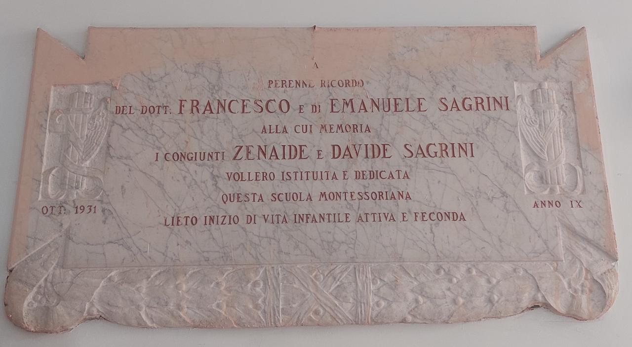 Nella lapide si ricorda l’istituzione di una sezione montessoriana presso l'Asilo infantile Ricci, avvenuta per volontà dei fratelli Zenaide e Davide Sagrini ed intitolata per loro volontà alla memoria dello zio Francesco Sagrini e del figlio di costui Emanuele. Il legame di parentele tra i dedicatari del ricordo marmoreo emerge da un’altra lapide, apposta presso l’Istituto Salesiano (di cui al momento non sembra esservi traccia), inaugurata l’anno prima, il 30 aprile 1930. In questa lapide, si apprende dagli Appunti di cronaca della Casa salesiana di Macerata, era scritto: «In memoria del Dr. Francesco Sagrini e figlio Emanuele / che accesi il cuore d’ardente carità essendone fedeli interpreti / i fratelli Zenaide e Davide largamente beneficiarono le opere del beato don Bosco».