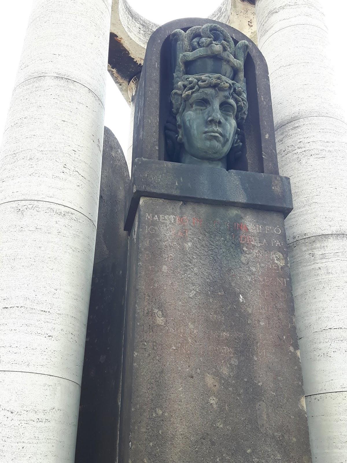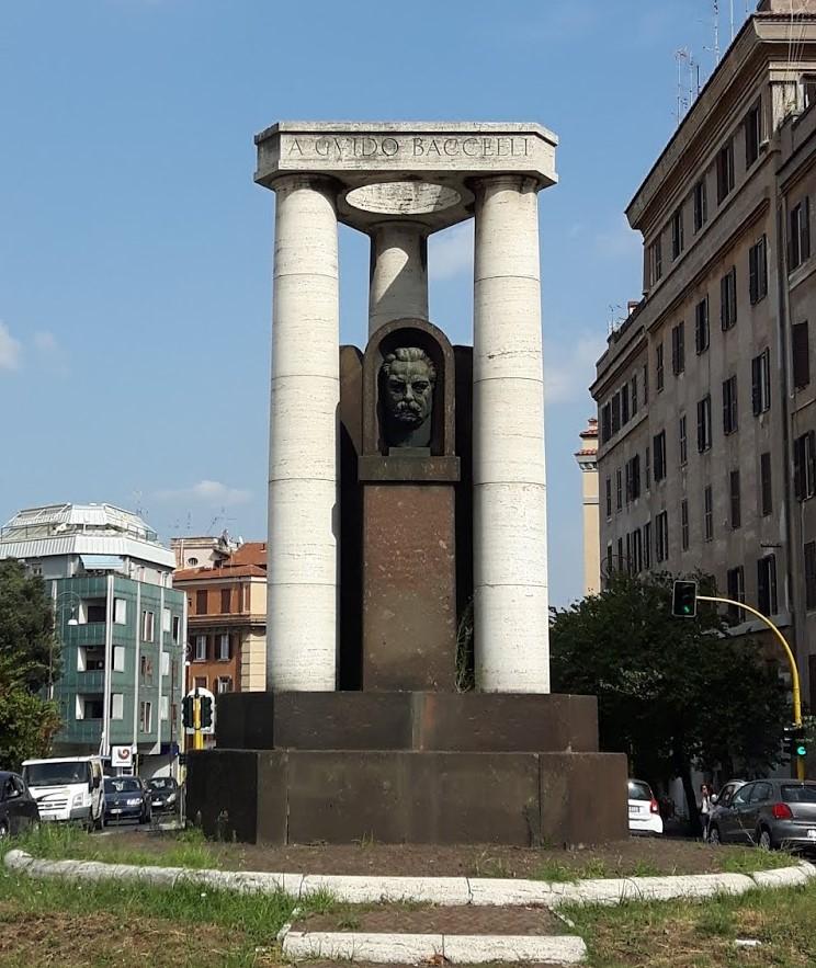 Le valenze del monumento a Guido Baccelli sono architettoniche prima che scultoree: tre colonne su cui poggia una trabeazione iscritta formano uno stilizzato tempietto in travertino; vi sono alloggiate tre stele in peperino sormontate da altrettante teste bronzee: Baccelli (Foto 2), l’Archeologia (Foto 3) e la Medicina (Foto 4) – queste raffigurate in allegorie femminili. Nell’illustrare i meriti di Baccelli titolare della Minerva, l’epigrafe al di sotto del ritratto di questo «ministro del Re» riferisce della rivendicazione dell'«autonomia delle università» dal potere politico e del progetto – mai realizzato – di una scuola complementare per analfabeti o seminalfabeti dai 15/16 anni ai 19 , che all’istruzione elementare coniugava l’«educazione premilitare»; l'iscrizione ricorda altresì l’istituzione della Festa degli Alberi, che vedeva le scolaresche alle prese con la messa a dimora di piante arboree. A promuovere l’erezione del monumento fu il Comitato nazionale per le onoranze a Guido Baccelli, costituitosi nel 1919 dall’unificazione di tre sodalizi che in maniera indipendente si proponevano di onorare la memoria del medico-ministro. Presiedette il Comitato Vittorio Ascoli, successore di Baccelli alla direzione della Clinica medica del Policlinico Umberto I di Roma. Nel 1926, poiché i risultati della sottoscrizione era scarsi, il Comitato consegnò la somma raccolta al governatore di Roma e si sciolse. Tuttavia il Duce, che vagheggiava per l'Italia il ripristino della «grandezza antica», voleva che il monumento si realizzasse: Baccelli ministro della Pubblica Istruzione si era segnalato per l’impegno a pro delle aree archeologiche capitoline (a quel tempo la tutela e la valorizzazione dei beni culturali erano affidate alla competenza di quel dicastero); «quasi presago dell’avvenire», il medico-ministro aveva così rievocato – come rammenta l’epigrafe al di sotto della testa femminile allegorica dell’Archeologia – «l’anima di Roma […] ispiratrice della nuova Italia». L’Amministrazione capitolina integrò i fondi mancanti, promosse un concorso scultorio e affidò l’esecuzione dell’opera ad Attilio Selva. Il monumento avrebbe dovuto inaugurarsi nella ricorrenza del centenario della nascita di Baccelli, che cadeva il 25 novembre 1930; tuttavia i lavori giunsero a conclusione agli inizi del 1931. La cerimonia di scoprimento del monumento si svolse nel dies natalis dell’Urbe, il 21 aprile 1931; fu il governatore di Roma Francesco Boncompagni Ludovisi a pronunciare un’orazione celebrativa di Baccelli.