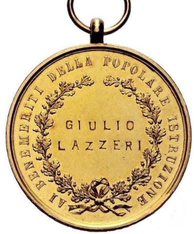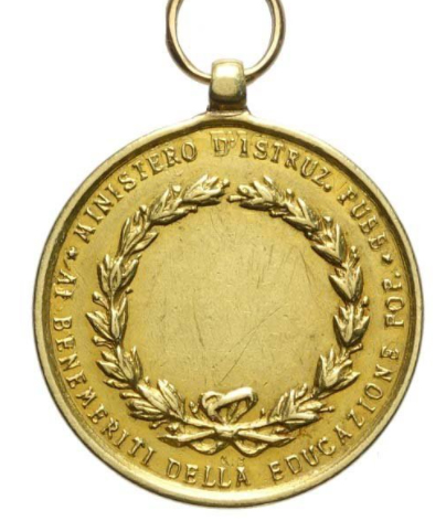 Al Diploma era associata una medaglia d'oro che riportava nel diritto la effigie del Re Vittorio Emanuele III rivolta verso sinistra e nel verso una corona di quercia che conteneva un campo vuoto nel quale veniva inserito il nome del benemerito (Foto 1) e (Foto 2) che poteva fregiarsi dell'onorificenza portando l'insegna alla parte sinistra del petto appesa ad un nastro di seta dai colori nazionali. Alcune varianti della medaglia pur presentando nel diritto l'effigie del Re Vittorio Emanuele III presentano nel verso l'incisione «MINISTERO D'ISTRUZ. PUBB. AI BENEMERITI DELLA EDUCAZIONE POPOLARE» oppure «MINISTERO D'ISTRUZ. PUBB. AI BENEMERITI DELLA EDUCAZIONE POP.». (Foto 3) e (Foto 4).