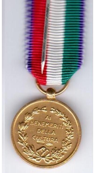larghezza di 32 mm che nel diritto presenta il simbolo della Repubblica (FOTO 1) e nel rovescio una corona di quercia che racchiude la leggenda “Ai benemeriti della cultura” (FOTO 2). Il conferimento è assegnato dal ministro della Pubblica Istruzione su parere di una Commissione e le modalità del conferimento sono state definite dal regolamento approvato dal D.P.R. n. 4553 del 18 dicembre 1952.