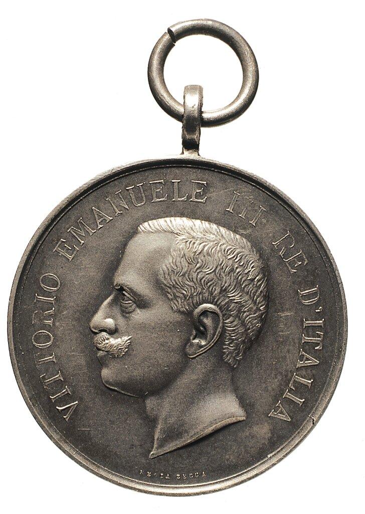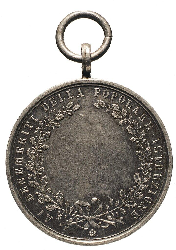 La medaglia d'argento, fu istituita ai sensi del R.D. n. 63 del 29 gennaio 1891, provvedimento che definiva il Regolamento per la distribuzione dei sussidi all’istruzione primaria e popolare. La decorazione veniva conferita dal Ministero della Pubblica Istruzione, agli insegnanti elementari e alle persone, che avevano mostrato, in modo singolare, di favorire l'istruzione e l'educazione popolare. Il Regolamento definiva i criteri per il conferimento della benemerenza. In particolare stabiliva che l'onorificenza dovesse essere attribuita annualmente a non più di un insegnante di una provincia la cui popolazione raggiungesse o superasse il numero di cinquecentomila abitanti. La medaglia veniva conferita ogni due anni, invece, a quei benemeriti che esercitavano l'insegnamento nelle province, con un numero inferiore a cinquecentomila abitanti. Definiva, inoltre, che la benemerenza poteva essere assegnata a chi risultava essere in possesso di specifici requisiti come la patente per l'insegnamento e di almeno otto anni di servizio. In ogni caso, tutti, dovevano dimostrare di possedere requisiti significativi, oltre allo zelo, costumi e capacità, come il numero degli alunni nelle loro classi e il grado di istruzione da questi raggiunto ciascun anno, la frequenza e il profitto degli alunni di tali scuole. Inoltre, si doveva considerare l'anzianità di servizio nello stesso comune e altri meriti speciali riconosciuti all'insegnante. Il R.D. n. 358 del 2 giugno 1895, stabiliva le caratteristiche della medaglia e autorizzava i maestri e le maestre a fregiarsene come insegna nelle occasioni pubbliche alla parte sinistra del petto, appesa ad un nastro di seta di color verde, con gli orli rossi. La medaglia prevedeva nel diritto la effigie rivolta a sinistra del re Umberto I di Savoia e nel verso un campo vuoto per dedica tra rami di quercia legati in basso e appesa ad un nastro di seta color verde orlato di rosso. A seguito dell'ascesa al trono di Vittorio Emanuele III, a partire dal conio del 1901, testo ed effigie incisi nel diritto della medaglia furono conseguentemente modificati (Foto 1) e nel verso una corona di quercia (Foto 2).