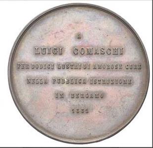Per celebrare la dedizione di Luigi Comaschi allo sviluppo della pubblica istruzione a Bergamo, fu prodotta nel 1881 una medaglia omaggio. Luigi Comaschi, di origini pavesi -era nato nel 1792- dopo essersi laureato in medicina e lettere, insegnò latino e greco nel liceo di Bergamo, dove introdusse lo studio della storia. Fu pubblicista e, in particolare, redattore unico della Gazzetta dal febbraio 1845 al gennaio 1852, e fino al 1789 collaborò in Notizie Patrie. Nel corso degli anni ricoperse diversi incarichi pubblici: fu consigliere comunale, assessore per l'istruzione, sopraintendente delle scuole municipali, provveditore per le scuole provinciali, presidente della Giunta di vigilanza delI'Istituto Tecnico, del Consiglio direttivo delI'Istituto dei sordomuti e dell' Ateneo. Oltre a ricevere la medaglia omaggio ottenne diverse onorificenze conferitegli dal Governo come il titolo di cavaliere e la medaglia d' argento per l' assistenza prestata ai soldati feriti e malati di colera. Morì a Bergamo il 29 agosto 1886. Diritto Anepigrafe. Nel centro, il busto di Luigi Comaschi rivolto a destra con mantello; nel campo in basso a sinistra nel taglio del busto si legge il nome dell’incisore G CALVI F. Contorno a piatto e gola (FOTO 1). Rovescio nel campo al centro la dedica distribuita in sei righe A /LUIGI COMASCHI/ PER DODICI LUSTRI DI AMOROSE CURE/ NELLA PUBBLICA ISTRUZIONE/IN BERGAMO/1881. Contorno a piatto e gola (FOTO 2).